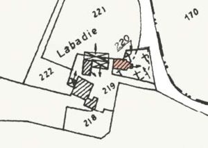 L'église de Sunarthe (Sauveterre-de-Béarn), en rouge sur le cadastre, près d'une maison portant le nom de Labadie