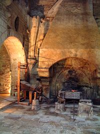 De ces innovations technologiques, qu'ils utilisent avec une grande acuité (il furent parmi les premiers à utiliser les foulons hydrauliques[16]), seul le marteau hydraulique peut véritablement être imputé aux moines cisterciens qui généralementisent l'emploi dans toute l'Europe[17]. Les cisterciens ont en effet besoin d'outillage agricole, mais également de terrassement, de construction, de clous pour les charpentes, de ferrures pour leur vitraux ou de serrures et lorsque les techniques architecturales évoluent, d'armatures en fer pour leurs bâtiments. Ils modifient les techniques respectant les traditions en mécanisant certaines étapes du travail du fer[18]. Dès le XIIe des forges actionnées à l'énergie hydraulique démultiplient la capacité de production des forgerons : l'utilisation de marteaux pilons sert à travailler des pièces plus imposantes (les marteaux de l'époque pouvaient peser 300kg et frapper 120 coups à la minute[19]) et plus rapidement (des marteaux de 80 kg frappant 200 coups à la minute[19]) et l'insufflation d'air sous pression permet d'obtenir des aciers de meilleure qualité (en élevant la température à plus de 1200° au sein des fours[19]). Dès 1168 les moines de Clairveaux vendent du fer[16]. Cette industrie sidérurgie est particulièrement gourmande en bois : pour obtenir 50kg de fer, il faut 200kg de minerai et 25 stères (m3) de bois : en 40 jours une seule charbonnière déboise une forêt sur un rayon de 1km[20]!